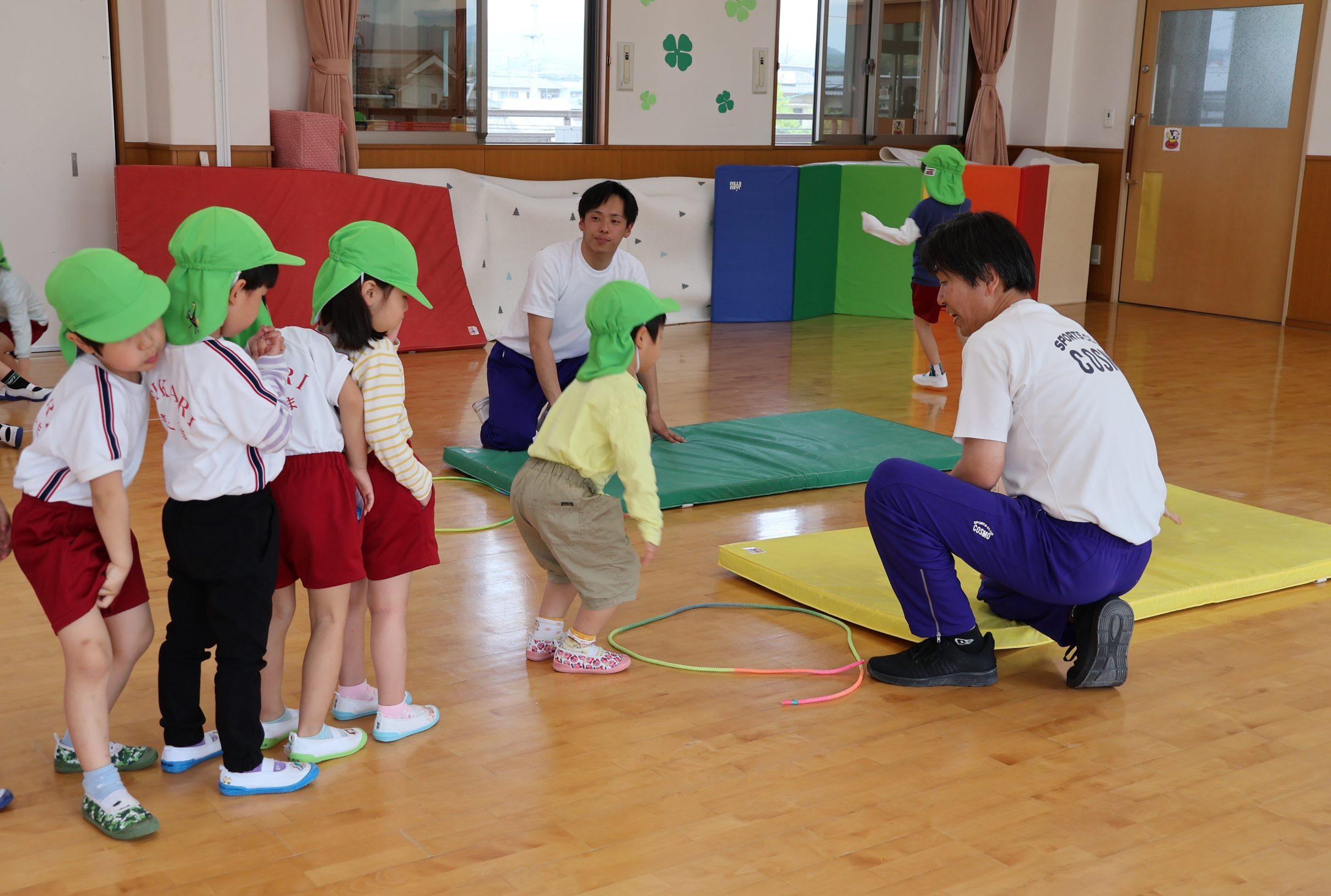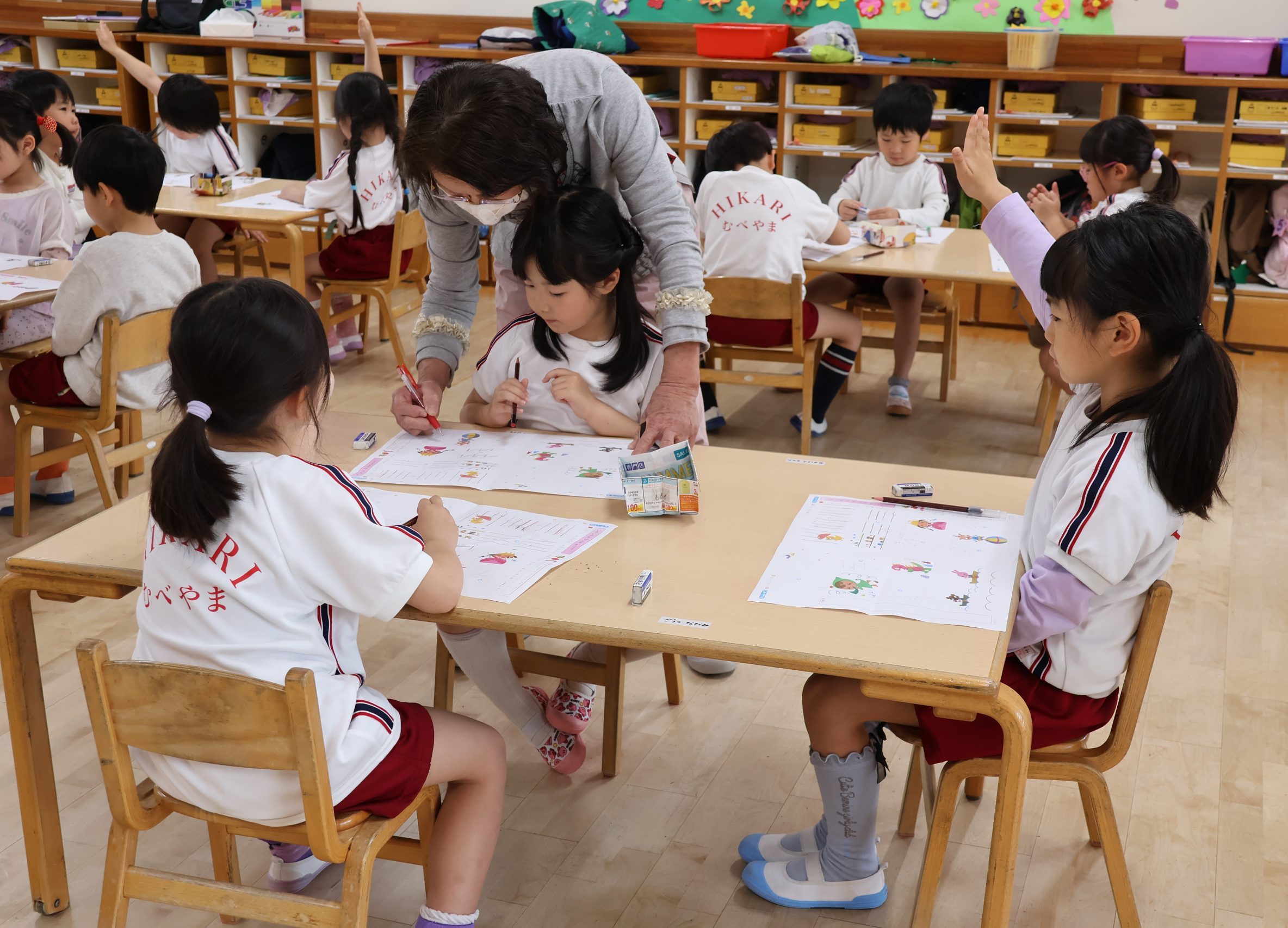 保育理念・保育方針 すべての子どもが,一人の人間として尊ばれ,愛され,保護され,それぞれの能力を可能な限り調和的に発展させていくなかで,豊かな人間形成の基礎を培っていく保育を実践します。 やさしい笑顔とわかりやすい温かいことばで,一人ひとりの子どもに話しかけていく『和顔愛語』の保育を実践します。 園の特色 英語教室(5歳児対象) 現在,世界の共通語の地位を獲得した英語。歌や劇あそび・ゲームなどを通してのレッスンでは,日本語は使わずに知っている単語や身ぶりなどでコミュニケーションをとるなど,自然に英語に親しめるようにと考えています。 ※指導は,外部講師にお願いしています。ネイティブ講師も来てくださっています。 硬筆教室(5歳児対象) 文字に興味を持ってきている子どもたちです。『文字を書く楽しさ』『正しい鉛筆の持ち方』『書き順や文字のバランス』など会得できるよう,おけいこしています。また,“硬筆おけいこ”をすることにより集中力も養っていきます。 ※指導は,外部講師にお願いしています。 体操教室(3・4・5歳児対象) 体を動かして活動することが大好きな子どもたちは,エネルギーに満ち溢れています。規律を守り安全に活動しながら,明るくいきいきと楽しく心身を鍛えています。 ※指導は,外部講師にお願いしています。